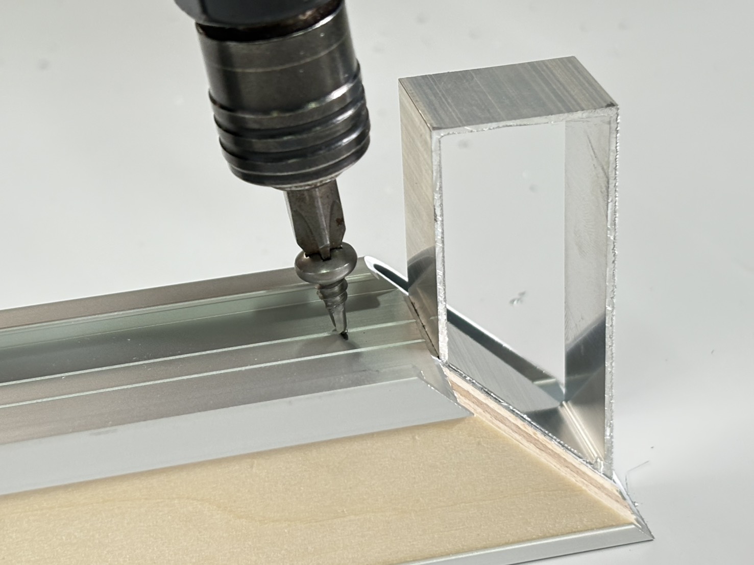 - コーナー金具に隙間が出ないよう、しっかりと押さえた状態でビス留めを行う